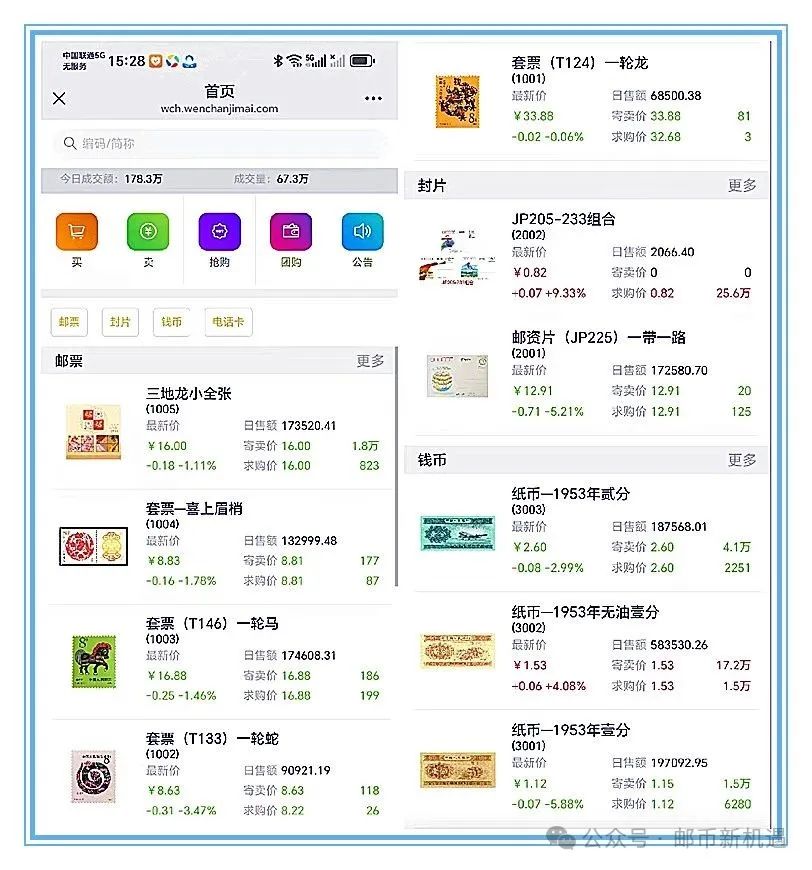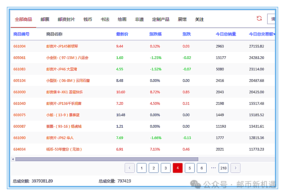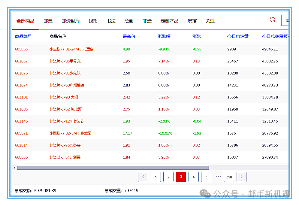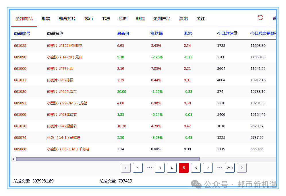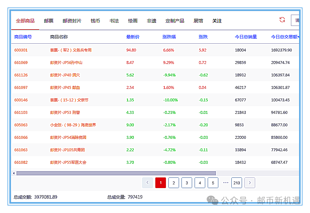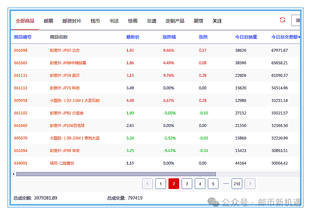 今天大盘总成交797419枚套/3979081.89元;其中邮票板块成交193961枚套/2247857.42元,占56.49%;封片板块成交553739枚套/1661383.24元,占41.75%;钱币板块成交49719枚套/69841.23元,占1.76%,邮票、封片板块成交量大幅增加,钱币板块成交量减少。