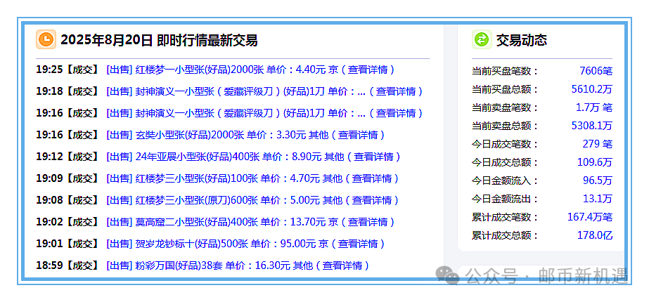 华夏邮币商城:8月20日,大盘开盘平稳,涨跌互现;10:20大盘成交111.3万元,其中1953年无油壹分涨停开板,放量39.7万元;其它成交较好三地龙张、1953年贰分,分别成交15.02、13.5万元;整个上午大盘没有发生大的变化,品种分化,以调整为主,成交大幅缩量,截止上午收盘,大盘总成交178.3万元,比昨天上午缩量44.6万元;其中1953年无油壹分收涨4.08%成交58.35万元,1953年壹分收跌-5.88%成交19.71万元,1953年贰分收跌-2.99%成交18.76万元,一轮马收跌-1.46%成交17.46万元,三地龙张收跌-1.11%成交17.35万元,一带一路收跌-5.21%成交17.26万元,喜上眉梢收跌-1.78%成交13.3万元,一轮蛇收跌-3.47%成交9.09万元,一轮龙收跌-0.06%成交6.85万元,邮资片组合收涨停成交2066.40元。