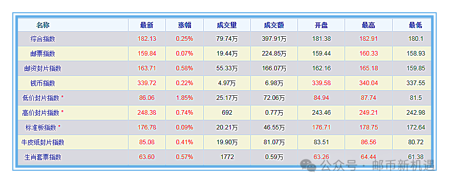 今天综合指数收报182.13涨0.25%,邮票指数收报159.84涨0.07%,封片指数收报163.71涨0.58%,钱币指数收报339.72涨0.22%。