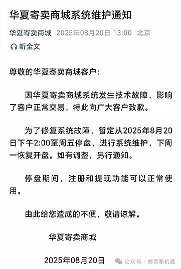 华夏官方公告,突发系统故障,从8月20日14时到周五停盘,初步确定下周一恢复开盘,如有调整另行通知。