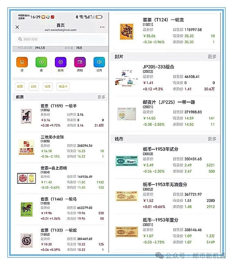 截止收盘,大盘成交294.53万元,比上个交易日缩量16.78万元,其中一轮马表现最好,量价齐升,收涨1.06%成交66.33万元;1953年壹分收跌-2.73%成交33.81万元,1953年贰分收跌-2.35%成交33.04万元,1953年无油壹分收涨0.66%成交26.77万元,一带一路收跌-2.55%成交37.19万元,一轮蛇收涨0.59%成交38.15万元,喜上眉梢收跌-3.63%成交16.19万元,三地龙张收跌-2.18%成交26.83万元,一轮龙收跌-0.96%成交11.6万元,邮资片组合继续涨停成交4.61元,一轮羊继续涨停成交3.16元。
