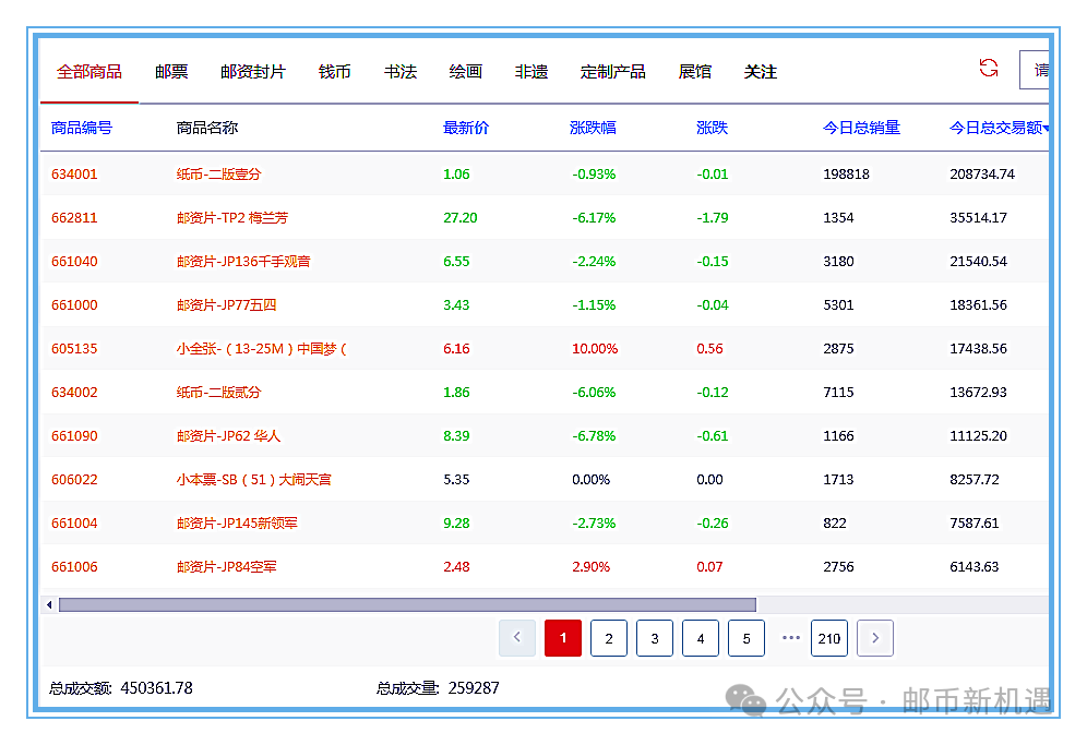 今天大盘总成交259287枚套/450361.78元;其中邮票板块成交14881枚套/65581.53元,占14.56%;封片板块成交36751枚套/155968.32元,占34.63%;钱币板块成交207655枚套/228811.93元,占50.81%,邮票、钱币板块成交量增加,封片板块成交量减少。