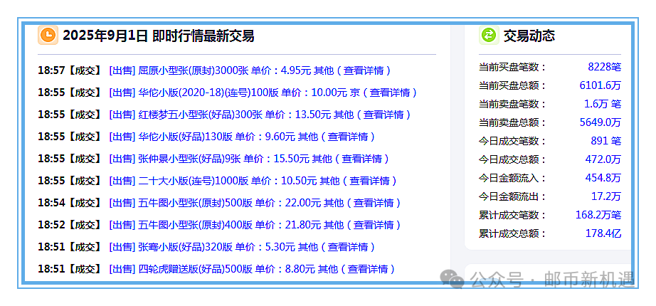 2025年8月,是邮币现货市场火爆月,互动网当月总成交6058万元,日均成交175.42万元;8月24日封神演义一小型张突破100元大关之后,日成交更是250万元以上,尤其是8月30日、31日两日分别成交484万元、509万元,是今年成交量最多的两天,今天截止19时便成交472万元,从成交量的变化可以看出行情火爆程度。