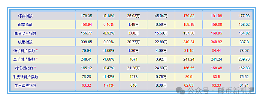 今天综合指数收报179.35跌-0.18%,邮票指数收报158.94涨0.16%,封片指数收报156.77跌-0.92%,钱币指数收报339.65持平。
