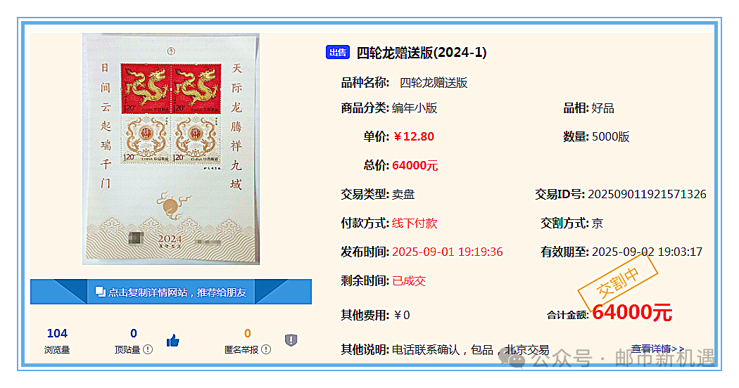 18:20互动网上邮市成交457.9万元,封神演义一小型张17张111.50元,稻城亚丁小型张1000张19.80元,洞庭湖小型张1000版21.00元,24年亚展小型张800张13元,西游记五双联200版79元,五牛图小型张300张18.70元,牡丹丝绸小型张200版33.60元,二十大小型张100张9.00元,西游记五小版100版18元,炎帝陵小型张1000张2.00元,千里江山图版票(整包)1000版12元,四轮虎赠送版2467版8.80元,四轮兔大版500版68元,JP114雷锋题词100枚2.50元,柳毅小本票3000本3.00元。