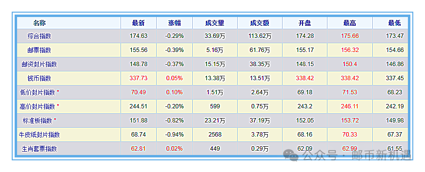 今天综合指数收报174.63跌-0.29%,邮票指数收报155.56跌-0.39%,封片指数收报148.78跌-0.37%,钱币指数收报337.73涨0.10%,三大板块指数涨跌不一。