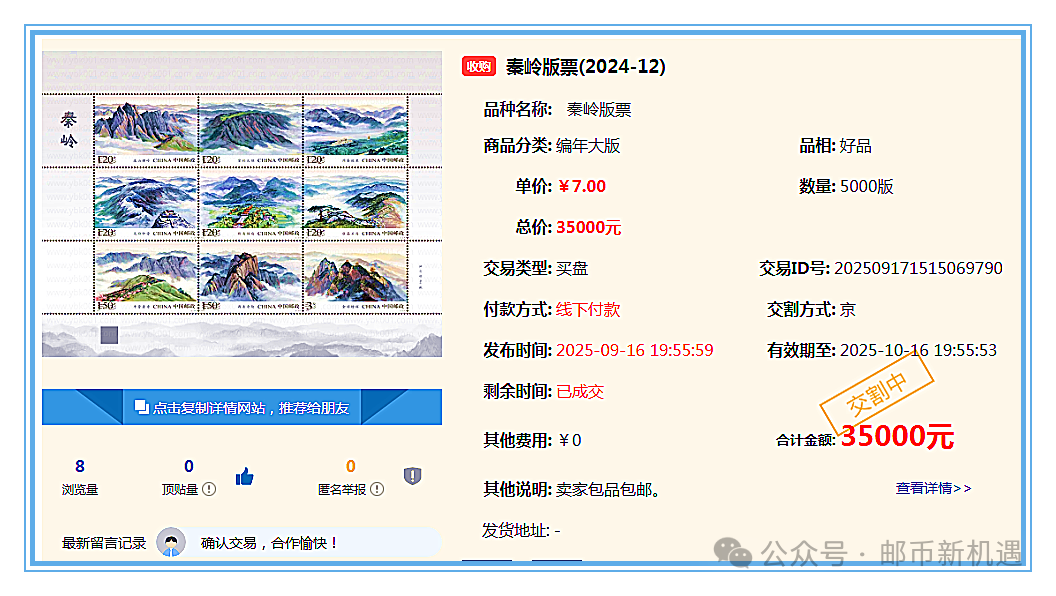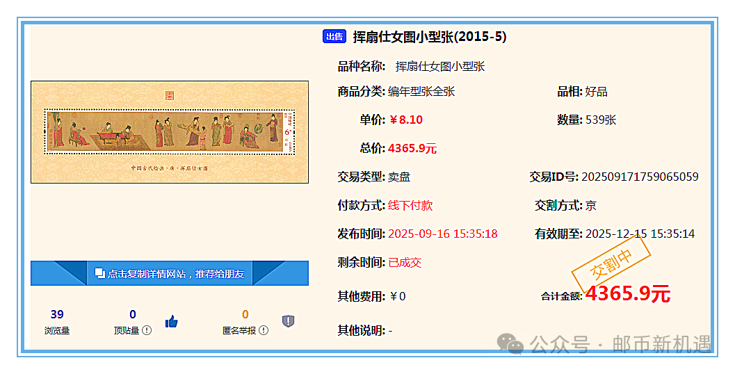 18:30互动网成交97万元,封神演义一小型张100张119元,封神演义一小型张(爱藏评级刀)2刀12410元,洞庭湖小型张860张35元,张仲景小型张1200张23元,稻城亚丁小型张300张15.80元,冬奥会竞赛场馆小型张1900张7.30元,挥扇仕女图小型张539张8.10元,抗战双联300张9.50元,二十大小型张900张8.00元,二十大小型张(原封)400张8.75元,解放军挂像英模小版200版18元,三轮马小本票1090本9.20元,安全教育日十周年大版300版48元,安全教育日十周年套票2000套2.50元,J172十一届亚运会三组套票300套1.80元,数藏二十四节气纪念封8套870元。