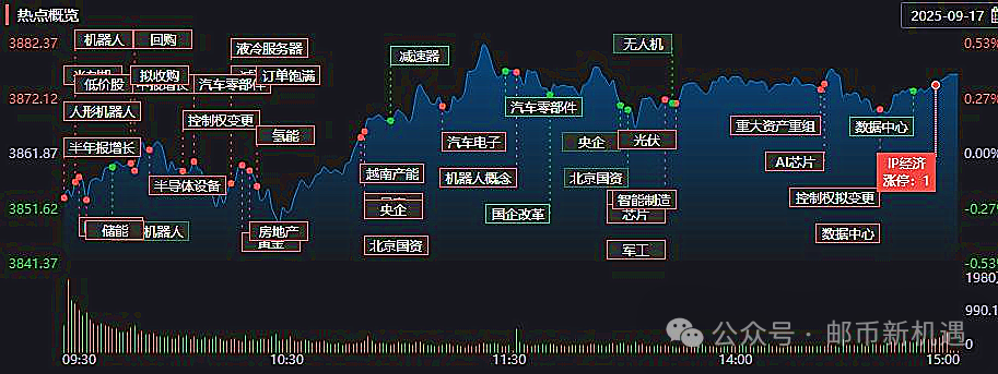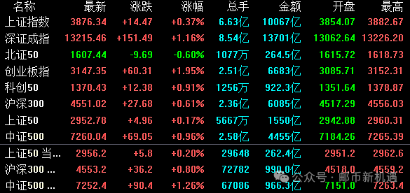 A股收评:9月17日,创业板指涨近2%再创3年多新高,机器人概念股持续爆发。A股三大指数今日集体上涨,截至收盘,上证指数3876.34涨0.37%,深证成指13215.46涨1.16%,创业板指3147.35涨1.95%,北证50指1607.44跌0.60%。沪深京三市全天成交额24029亿元,较上日放量359亿元,全市场超2500只个股上涨。
