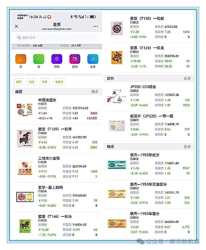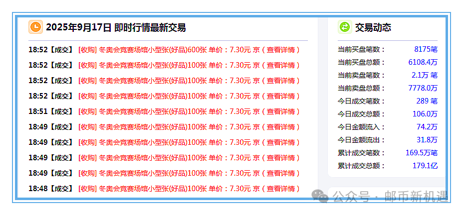 品种表现:中国龙组合以1.01元收涨1.00成交122.72万元,比昨天减少42.16万元;一轮羊以4.44元收跌-5.93%%,成交46.13万元;三地龙张以9.11元收跌-9.53%成交26.37万元;喜上眉梢以7.05元收跌-8.68%,成交10.1万元;一轮马以15元收跌-7.69%,成交11.68万元;一轮蛇以7.28元收跌-9.90%,成交6.75万元;一轮龙以28.80元收跌-7.10%,成交25.87万元;邮资片组合以1.50元收跌-5.66%,成交12.7万元;一带一路以8.06元收跌-9.94%,成交11.65万元;1953年贰分以1.45元收跌-6.45%,成交17.46万元;1953年无油壹分以1.00元收跌-2.91%,成交14.13万元;1953年壹分以0.67元收跌-9.46%,成交26.24万元。