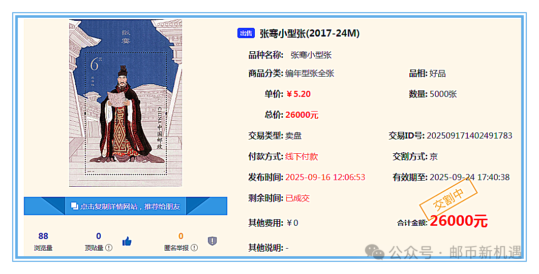 互动网邮币市场:9月16日互动网成交333万元,其中封神演义一小型张成交3649张43万元,张仲景小型张关注度最高;截止9月17日19时关成交106万元,行情变化快,随时关注行情变化。