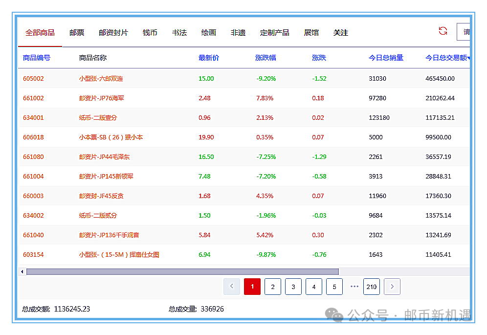 龙虎榜:今天成交上万元品种10个5涨5跌;分别是六邮双连张、海军片、二版壹分、猴小本、主席片、新领军、反贪、二版贰分、千手观音、挥扇仕女图张。