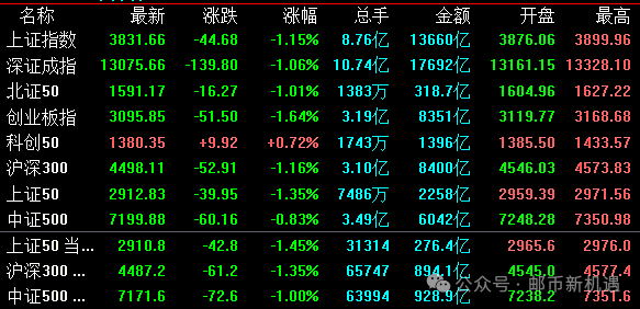 A股收评:9月18日,沪指放量调整跌1.15% 有色金属、证券板块跌幅居前。A股三大指数今日集体下跌,截至收盘,上证指数3831.66跌1.15%,深证成指13075.66跌1.06%,创业板指3095.85跌1.64%,北证50指数1591.17跌1.01%。沪深京三市全天成交额31666亿元,较上日放量7637亿元,创年内第三,全市场超4300只个股下跌。