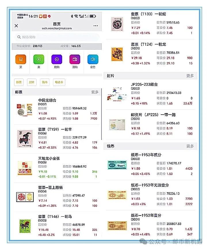 品种表现:中国龙组合以1.08元收涨6.93成交95.94万元,比昨天减少26.78万元;一轮羊以4.81元收涨8.33%%,成交22.92万元;三地龙张以9.10元收跌-0.11%成交15.69万元;喜上眉梢以7.14元收涨1.28%,成交4.74万元;一轮马以15.48元收涨3.20%,成交4.69万元;一轮蛇以7.29元收涨0.14%,成交5.95万元;一轮龙以29.18元收涨1.32%,成交7.84万元;邮资片组合以1.65元收涨停成交29.35万元;一带一路以8.18元收涨1.49%,成交6.44万元;1953年贰分以1.50元收涨3.45%,成交17.43万元;1953年无油壹分以1.03元收涨3.00%,成交7.82万元;1953年壹分以0.70元收涨4.48%,成交20.09万元。