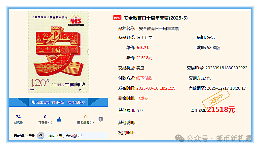 这两天又出现一个好现象,那就是安全教育日十周年套票、24年烈士纪念日套票等大量成交,而且价格不菲,像安全教育日十周年套票面值1.20元,市价已高达3.71元,相比面值涨幅不小;还有像24年烈士纪念日套票都站上了1.20元面值;这源于大家不断的挖掘,并非说哪一个板块才好,其实每一个板块中都不乏有好品种,关键看自己能否慧眼识珠,有独到的远见和见解。