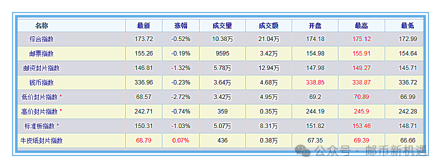 今天综合指数收报173.72跌-0.52%,邮票指数收报155.26跌-0.19%,封片指数收报146.81跌-1.32%,钱币指数收报336.96跌-0.23%,三大板块指数全线大跌。