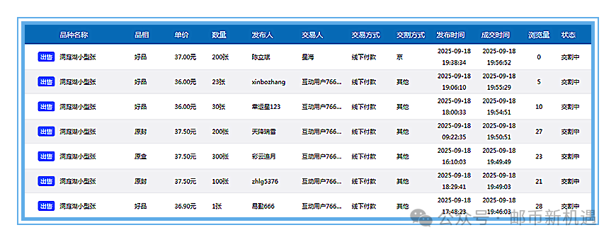 20.00互动网成交177.6万元,封神演义一小型张100张118元,洞庭湖小型张600张37.50元,莫高窟二小型张200张12.50元,24年亚展小型张200张10.80元,09年牡丹小型张3000张6.00元,三轮龙小本票400本15元,抗战胜利八十周年版票30套26元,安全教育日十周年套票7800套3.71元,24年烈士纪念日套票3437套1.20元。