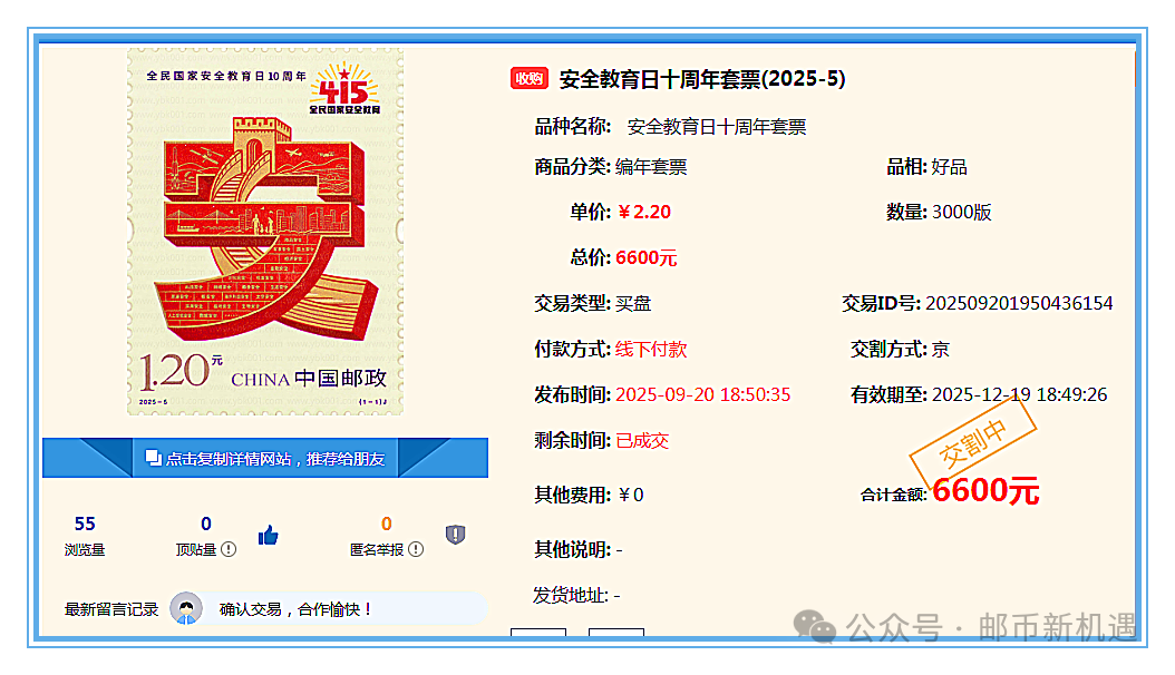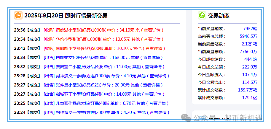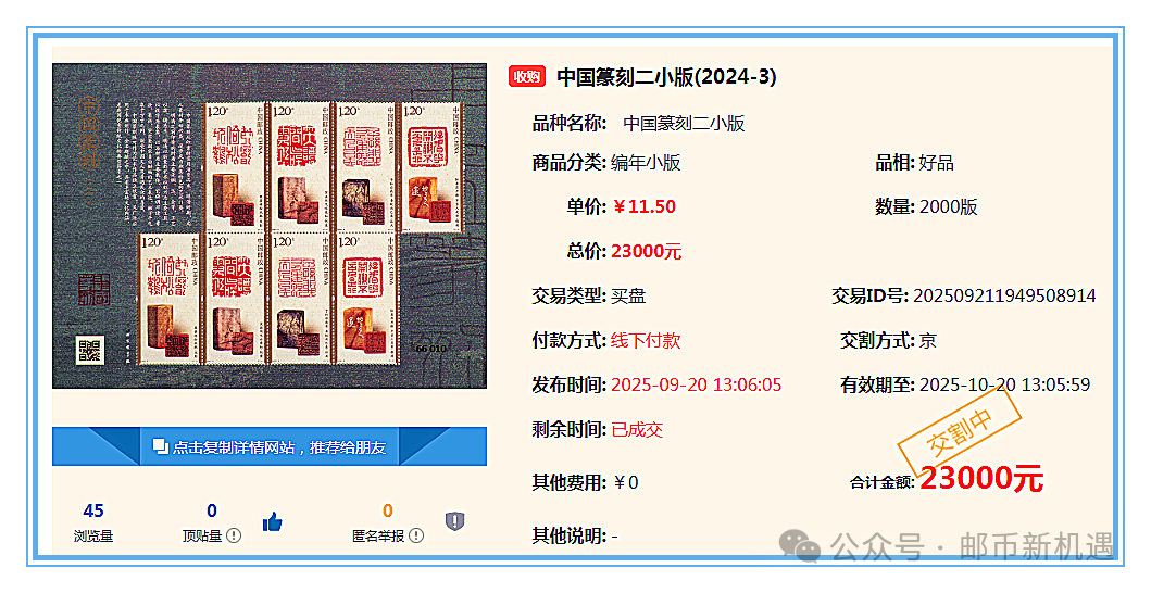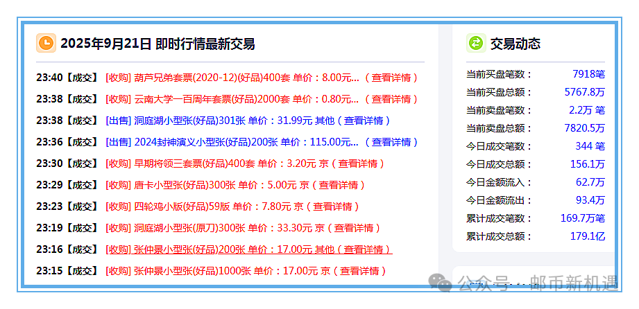 20:30互动网成交131.2万元,封神演义一小型张100张115元,洞庭湖小型张200张33.20元,张仲景小型张(百连)200张19.50元,张仲景小型张(原封)500张20元,稻城亚丁小型张200张14元,二十大小型张200张7.50元,中国篆刻二小版2000版11.50元,捣练图小型张500张7.95元,红楼梦五小型张1000张10.50元,千岛湖小型张800张3.80元,四轮龙小版300版18.80元,四轮兔小版500版12元,抗战胜利八十周年小型张400张10.50元,抗战胜利八十周年版票190套20元,神舟飞船大版28版106元,安全教育日十周年套票1000套2.55元。