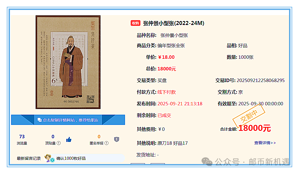 23:00互动网成交144.9万元,洞庭湖小型张428张33元,张仲景小型张1000张18元,莫高窟二小型张300张11.560元,鲁班小型张700张6.00元,现代桥梁建设小型张1000张8.40元,香港回归小型张270张4.00元,宝鼎无齿小型张100张9.00元,黄山小版500版7.85元,千岛湖小型张1000张3.50元,抗战胜利八十周年小型张200张11.28元,四轮蛇小版200版14.50元,诸葛亮小型张1400张4.30元,四轮狗赠送版1000版4.60元,四景山水图小全张1000张5.50元,封神演义一套票628套4.48元。