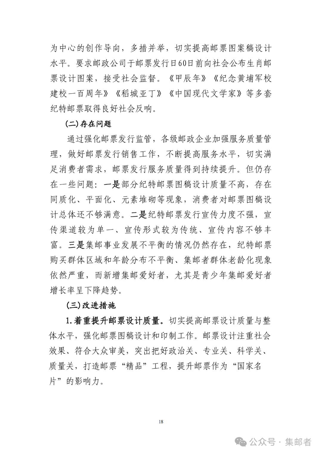 改进措施:提升邮票设计质量,提高宣传水平,强化集邮队伍建设,吸引青少年参与集邮。以上为国家邮政局官方报告